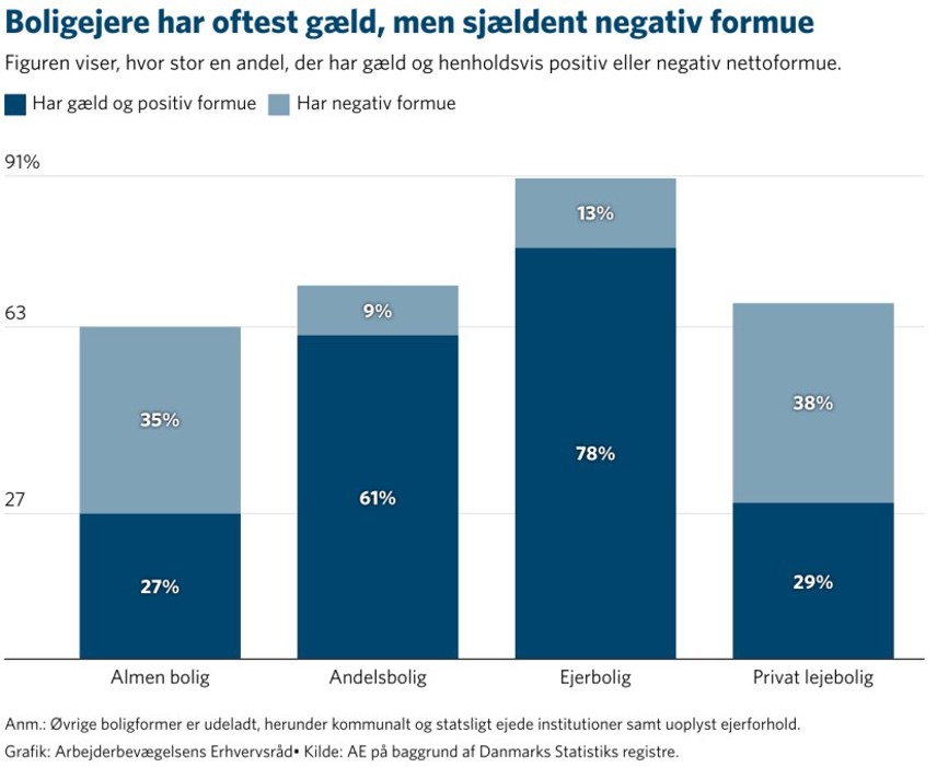 På tværs af alle familietyper i almene boliger er den negative formue på over 100.000 kr., mens den for private lejere er over 200.000 kr. og altså over 300.000 kr. blandt børnefamilierne.